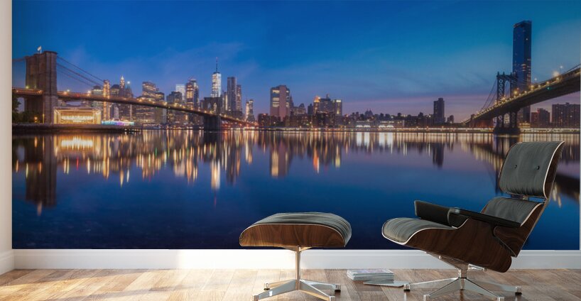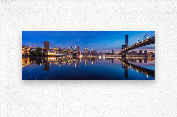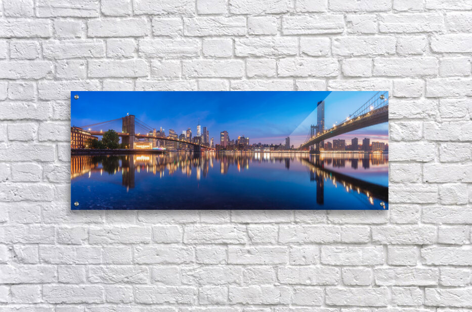 Immerse yourself in the quiet elegance of New York City with this panoramic twilight photograph. NEW YORK SKYLINE PANORAMA captures the city as day transitions to night, with the Brooklyn Bridge on the left and the Manhattan Bridge on the right. The soft blue hues of the sky and the gentle reflections on the water create a harmonious balance between architecture and atmosphere. Ideal for lovers of cityscapes, travel, and urban design, this artwork is available in canvas, acrylic, metal, mural, framed print, rolled print, and digital download formats. Each print includes a Certificate of Authenticity, ensuring its value and uniqueness.