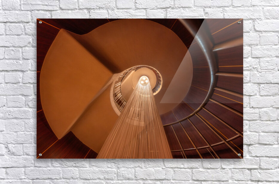 Step into architectural elegance with this upward view of a spiral staircase in Osaka, Japan. Spiral Staircase Osaka captures the warm textures of wood and metal, leading the eye toward a chandelier of cascading light strands. The symmetrical composition and ambient glow create a sense of depth and refinement, offering a unique perspective on interior design and craftsmanship. This image is perfect for lovers of architectural photography, geometric forms, and atmospheric wall art. Available in canvas, acrylic, metal, mural, framed print, rolled print, and digital download formats. Each print includes a certificate of authenticity, ensuring its value and uniqueness